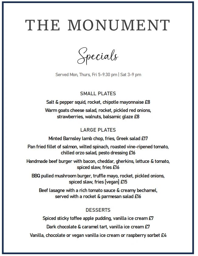 We now serve Seasonal Specials on Mondays, Thursdays, Fridays and Saturdays, Sourdough Pizza on Tuesdays & Wednesdays, and Sunday Roasts.